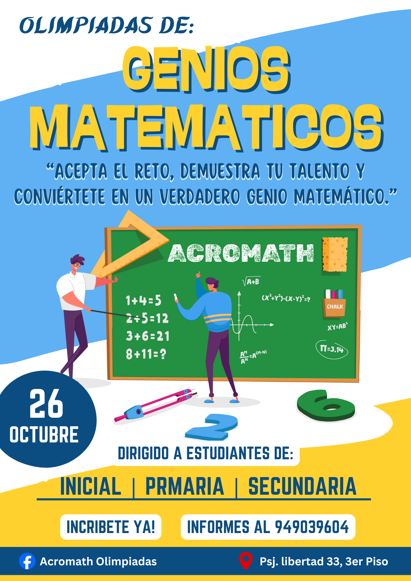 ContáctarLlegó el día de otro certamen de concursos de Matemática y Comunicación "Concurso Escolar Rally Matemático" y "Concurso Regional Escolar de Comunicación" el 21 de setiembre del 2025. Dirigido a estudintes escolares de los niveles de Inicial, Primaria y Secundaria. Región Tacna.